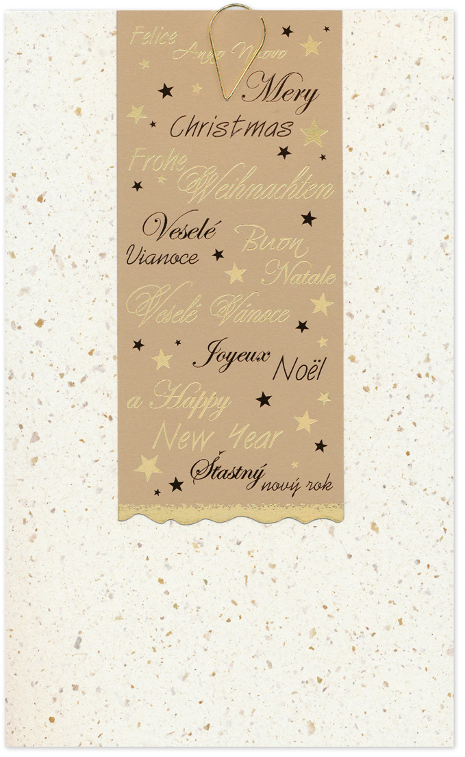| Popis: | Otevírací novoročenka ze zajímavého recyklovaného papíru. Na titulní straně je zlatou sponkou připevněn tvarový výsek z hnědého papíru se zlatou a hnědou ražbou. Pro dotisk textu je uvnitř vložena kartička z přírodně bílého grafického papíru. |