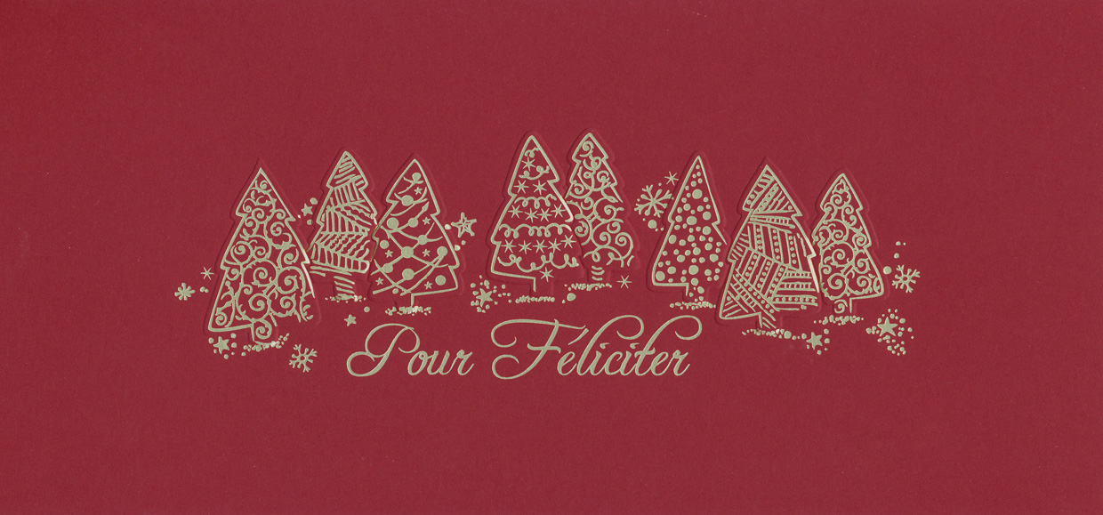 | Popis: | Otevírací novoročenka z tmavě červeného grafického papíru. Motiv na titulní straně je tvořen zlatou matnou ražbou a slepotiskem. Uvnitř je vložena kartička z přírodně bílého grafického papíru. |