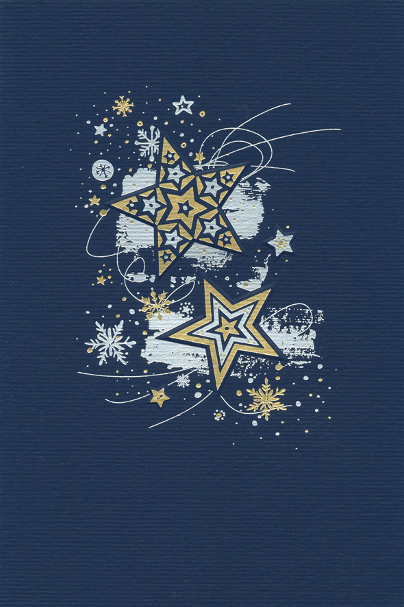 | Popis: | Otevírací novoročenka z tmavě modrého grafického papíru s motivem, který je tvořen zlatou, stříbrnou ražbou a slepotiskem. Pro dotisk textu je uvnitř vložena kartička z bílého perleťového papíru. |
